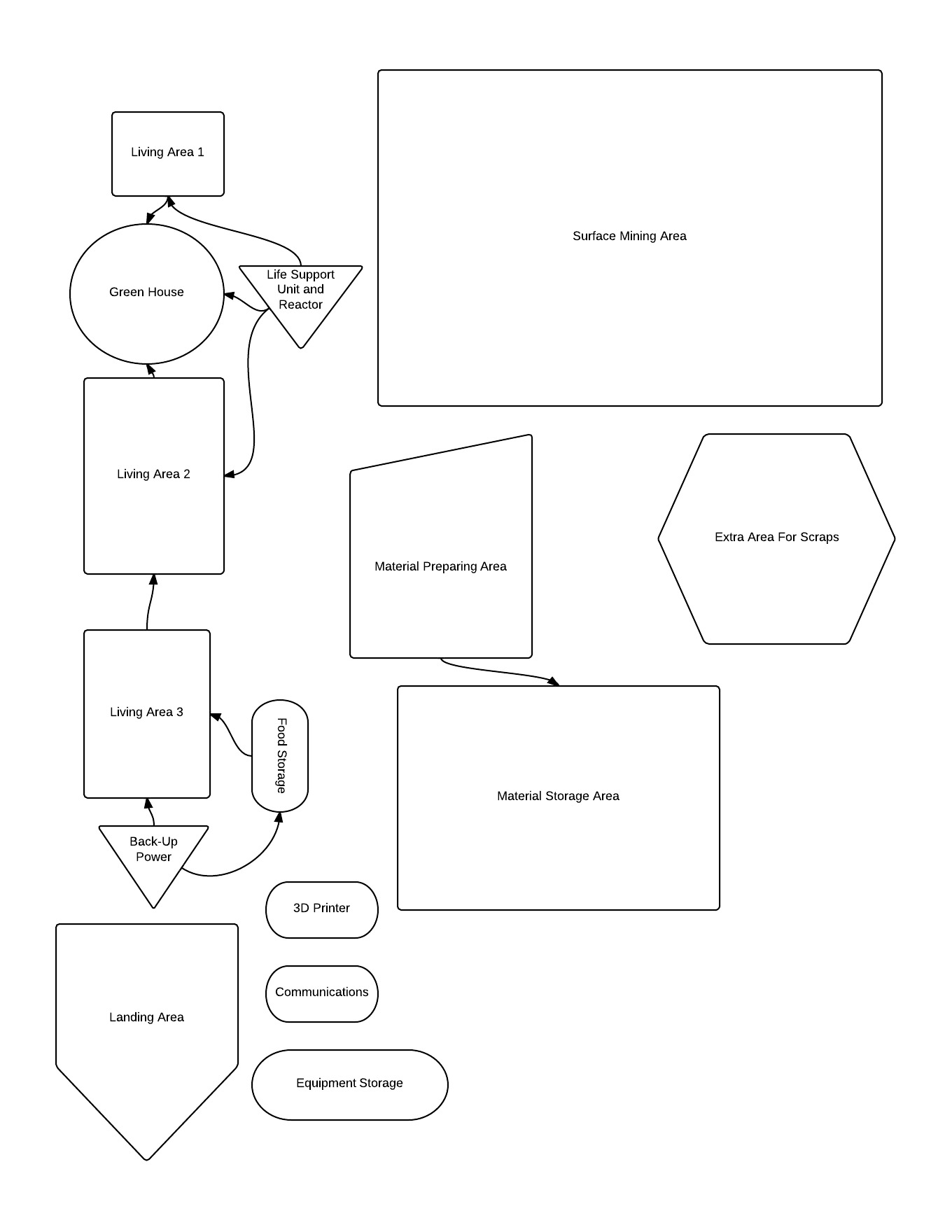 | The map shows work areas on Mercury where the materials are extracted. The largest space of the colony is dedicated to mining, plus three living quarters, so if in case one fails, the rest will be ok. It works the same with the reactor and power source. We have also dedicated a LARGE space for preparing, separating, and smelting the material. The landing area is where the ship would ship the material away and the new crew would come in. The scale of my map for 1cm squared is length 10m x width 10m.